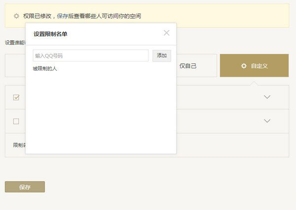 在設置限制名單里,輸入他(她)的QQ號,點擊添加,然后點擊保存即可,這個這個人就不能看到你動態了,是不是很簡單呢,如果有需要的朋友可以試下哦!
