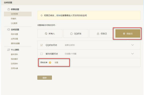 第三步:進入空間設置,就會看到這里有許多可以設置的,比如設置空間對所有人可見,對QQ好友所見,不想讓任何人看到就設置成對自己可見,已經自己定義可見的對象,設置好了以后點擊保存即可。
