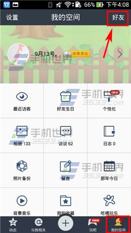 1)安裝并打開(kāi)手機(jī)QQ空間,進(jìn)入首頁(yè)后點(diǎn)擊右下角【我的空間】,點(diǎn)擊右上角【好友】。(如下圖)