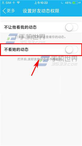 2)點(diǎn)擊【動(dòng)態(tài)權(quán)限設(shè)置】,點(diǎn)擊打開【不看她的動(dòng)態(tài)】即該好友的動(dòng)態(tài)將不再顯示。(如下圖)
