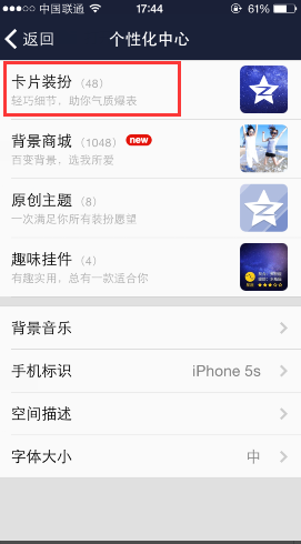 2、在個性化中心里,大家很清楚的看到了卡片裝扮,點擊進入;