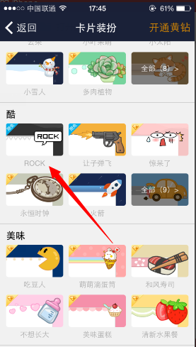 3、在卡片裝扮里大家可以看到許多都是需要開通黃鉆才能夠使用的,仔細找一找還是會有免費的,比如小編所找到的ROCK風的卡片,直接點擊圖片;