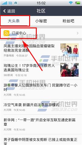 1)首先打開【手機QQ空間】,進入界面后點擊左下角【動態】后再點擊【社區】,進入的就是【大頭條】界面了,點擊下方的【訂閱中心】。(如下圖)