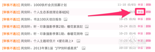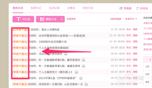2、進入日志列表,此時可以查看到沒有通過審核的日志文章目錄,找到自己想要申述的文章,進入下一步。