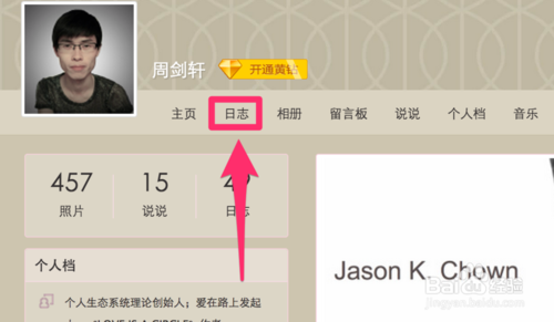 1、打開自己的QQ空間主頁,在空間首頁上方的導航欄中找到“日志”這一欄并點擊進入下一步。