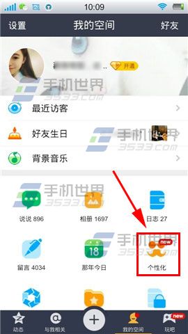 1)打開手機QQ空間,點擊【我的空間】,接著點擊【個性化】。(如下圖)