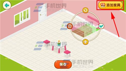 3)點擊一個【家具】就可以旋轉移動和刪除,右上方的【添加家具】呢,則是我的倉庫啦,里面有各種家具裝飾,趕快裝扮自己的小窩吧。(如下圖)