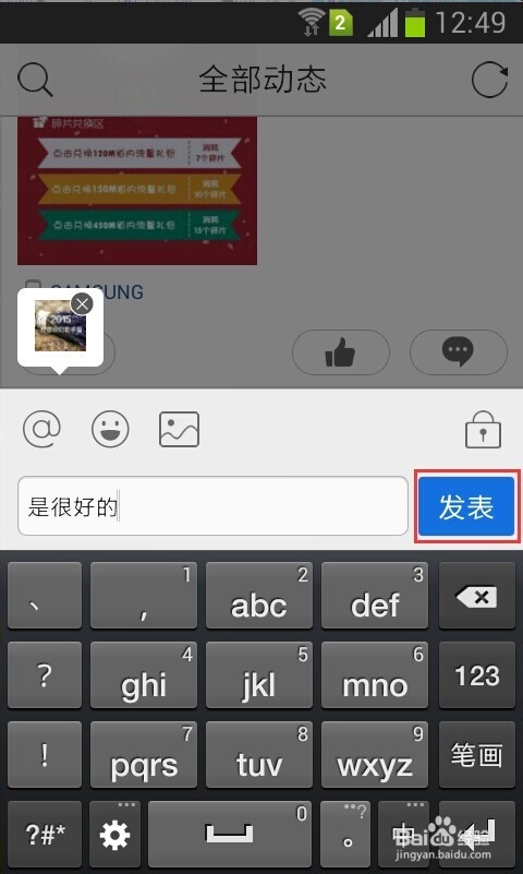 向上滑屏,找到需要的好友或者自己的動態加以評論添加照片,單擊【玩吧】上面所對應的標志,紅線所圈區域