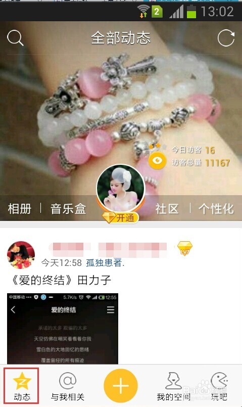 單擊下圖我的空間,或者動態都可以,動態是好友和自己的動態都在里面,若是單擊我的空間,就是自己的動態,所以根據自己的選擇而定,以單擊動態為例