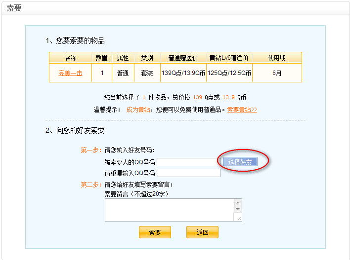 4、勾選一個黃鉆達到LV2以上等級的,進行留言后點擊“索要”。