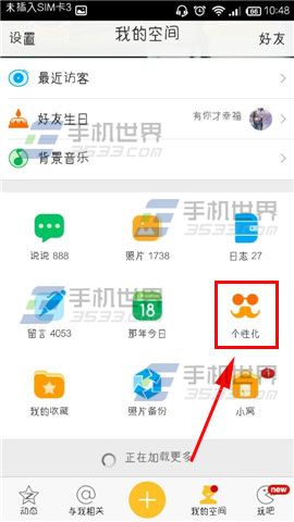 1)打開手機QQ空間,點擊【我的空間】頁面,往下拉進入【個性化】的版塊。(如下圖)