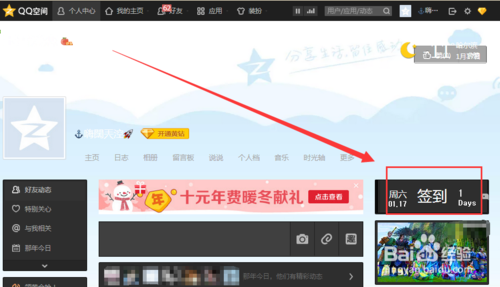 2、進入自己的QQ空間以后,在首頁的右側找到【簽到】按鈕,并單擊打開,如下圖所示。