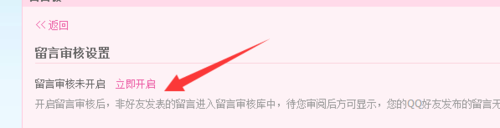 4、點擊留言板設置,我們可以看到留言板審核【立即開啟】選項,我們點擊