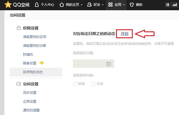 三、在QQ空間權限設置中,點擊左側的【封存我的動態】設置,然后先開啟“封存指定日期之前的動態”,如下圖所示。