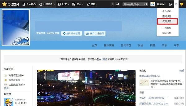 二、進入QQ空間之后,點擊右上角的【設置】圖標,然后選擇【權限設置】,如下圖所示。