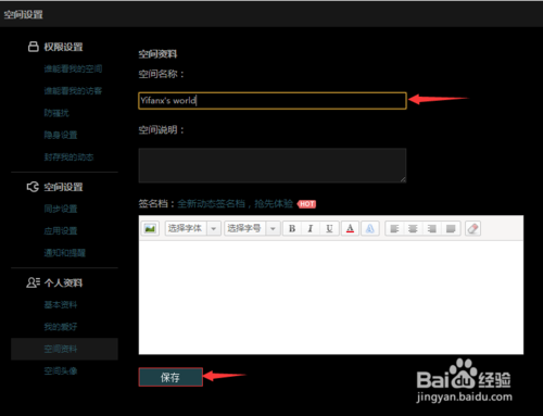 4、然后在”空間昵稱“輸入自己喜歡的空間昵稱,然后點擊保存就行了!