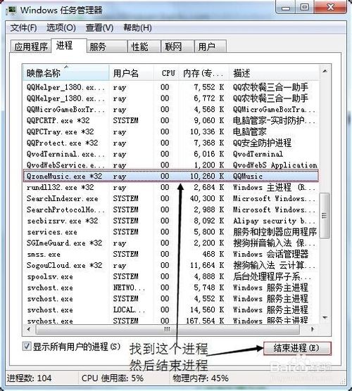3、找到QzoneMusic.exe *32這個進(jìn)程,然后將它結(jié)束掉。