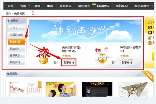 進入免費專區以后,首先看到的是“時事熱點”的專區,這個專區你只要單擊“我要支持”,即可獲得相應的裝飾品。