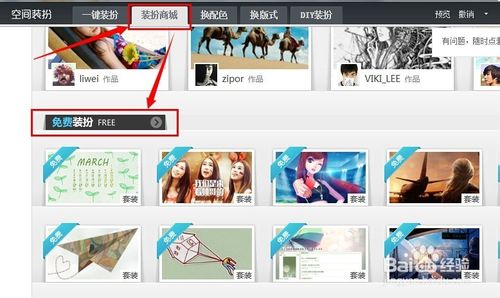 進入裝扮商城,可以看到很多空間皮膚等,拉下滾動條,可以找到一個“免費裝扮”的專區,點擊進入免費專區。