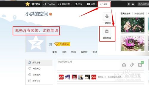 進入空間以后,在沒有裝扮之前,看起來是很單調的。這個時候,點擊“裝扮”選項的“裝扮商城”。