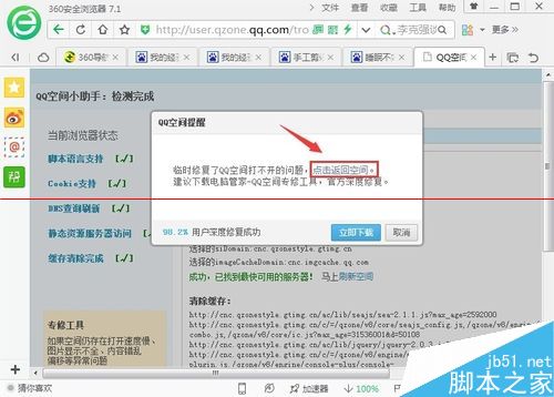 5、下載完成以后,彈出了一個對話框,上面提示臨時修復了qq空間打不開的問題,可以點擊返回空間,我們點回去試一下,如圖所示。