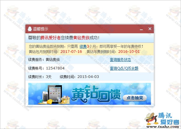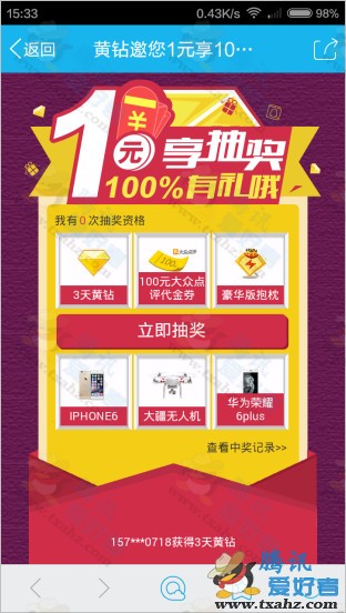 3、小編測試截圖,1Q幣中了3天黃鉆。【不限制購買次數,抽獎資格可累計】