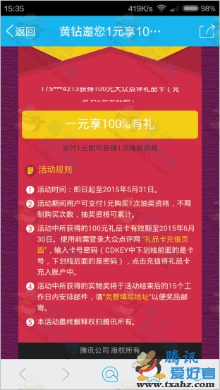 3. 活動中所獲得的100元禮品卡有效期至2015年6月30日。使用前需登錄大眾點評網 “禮品卡充值頁面”,輸入卡號密碼(CDKEY中下劃線前面的是卡號下劃線后面的是密碼),點擊充值將禮品卡充入賬戶中。