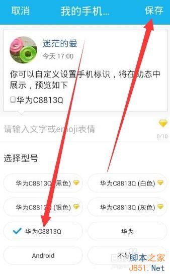 3、點擊之后就進入到了手機標識的界面,選擇自己手機的型號,如果沒有開通黃鉆,只能選擇手機的型號,不能選擇手機型號并且附帶顏色,選擇好后點擊確認即可。小編的手機型號是華為C8813Q,所以選擇這個型號作為示例。