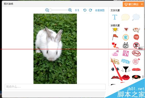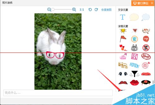 5、點開'涂鴉"的功能后,會呈現(xiàn)如下圖所示的模樣,在右邊的“文字元素”或“涂鴉元素”中選擇你要涂鴉的元素,左鍵點擊一下,然后將其拖入到圖片中就可以了。