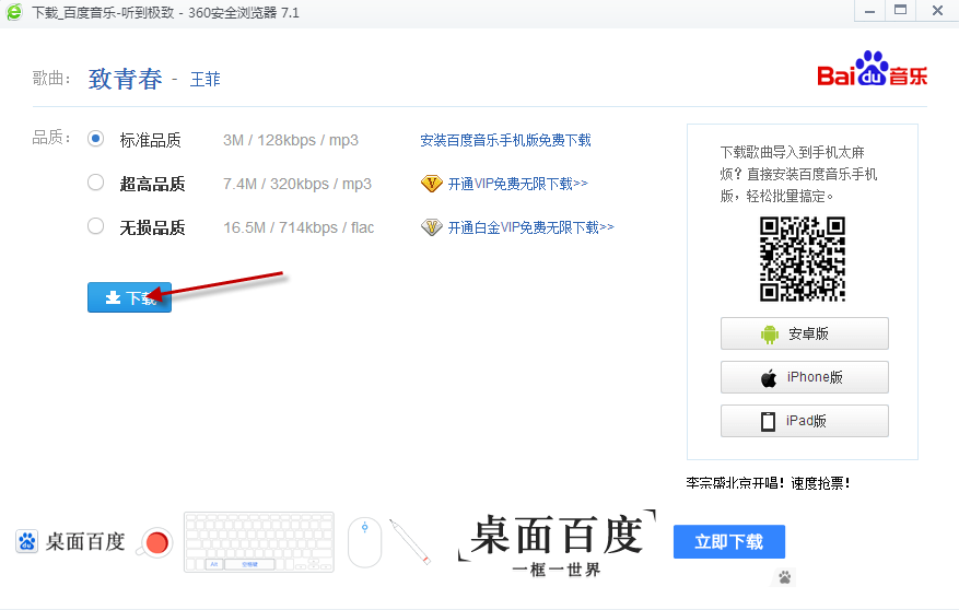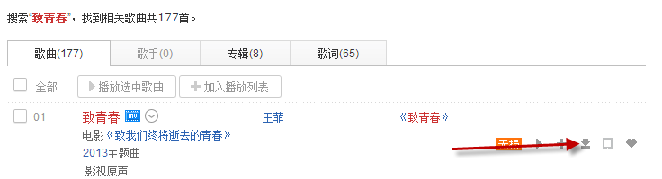 1、首先,打開百度音樂網頁,搜索你鐘愛的歌曲,這里我就搜致青春,然后點擊播放試聽一下是不是自己想要的那首歌