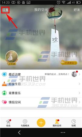1)打開進(jìn)入QQ空間,點(diǎn)擊下方功能欄【我的】,點(diǎn)擊我的空間左上角【設(shè)置】。(如下圖)