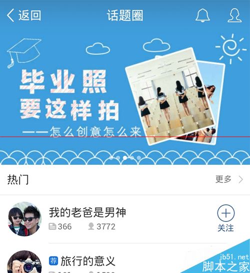 1、進入話題圈,你可以看到當前最熱門的話題,不管理是上方的滾動顯示的大頭帖,還是在熱門話題列表里。