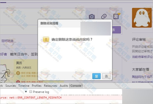 2、右擊說說審查元素,打開審查元素后點擊 Console,粘貼刪除說說的代碼(文章底部下載)