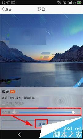 2)找到全屏背景,點擊你要使用的【全屏背景】進行下載,下載完成后自動跳轉預覽頁面,【調節透明度】,點擊下方【使用】即可。(如下圖)