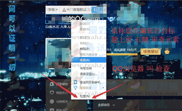 1.首先我們打開自己的QQ空間,使用的瀏覽器必須支持審查元素,點擊修改標題,我們點擊編輯。