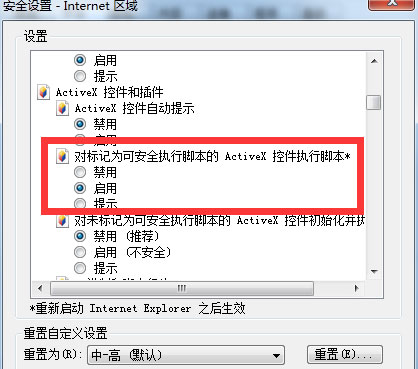 4. 對“對標記為可安全執行腳本的ActiveX控件執行腳本”設置為“啟用”;
