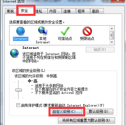 3. 進入“安全”頁面,點擊“自定義級別”;