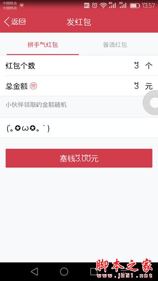 5、設置【紅包個數】以及【總金額】,然后點擊【塞錢】按鈕進入支付界面,輸入【支付密碼】;