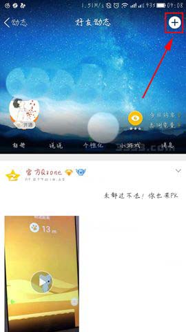 1)首先我們打開手機QQ來到動態界面點擊進入【好友動態】,接著再點擊右上角的【+】。(如下圖)
