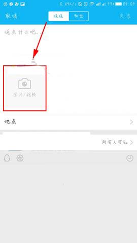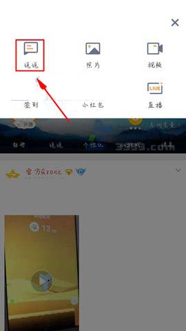 2)然后再點擊【說說】,接著再單擊【照片/視頻】。(如下圖)