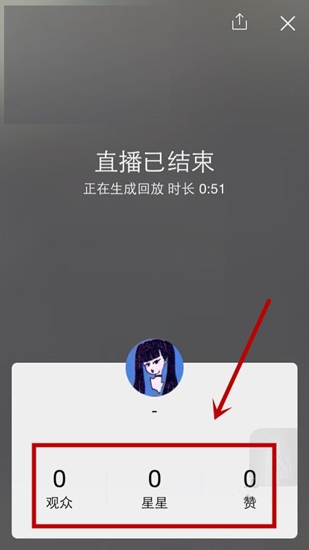 3、點擊右上角的“x”就可以結束直播了,結束直播之后系統會自動生成直播回放,同時大家還可以在下方看到觀眾、星星、贊的統計數據喲,實在是太方便啦!
