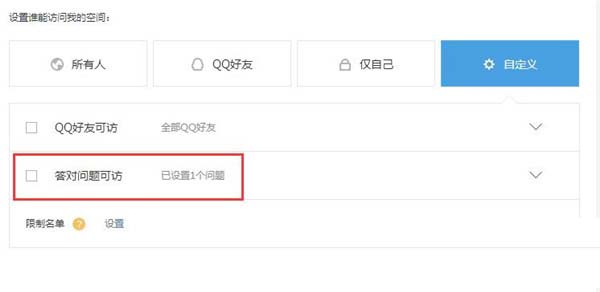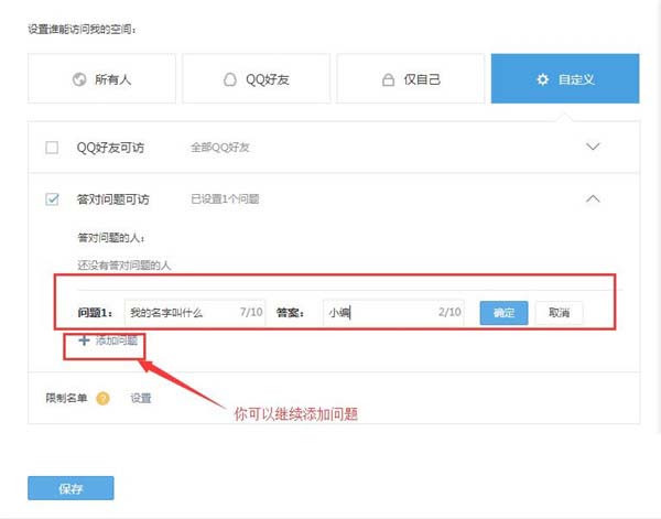 4、選擇回答問題訪問,一般是沒有什么人能回答得出來你自己設置的問題的,也就是別人進不了你的空間了;