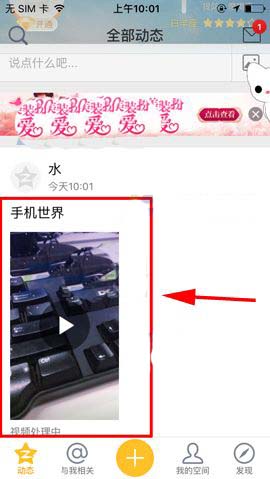 4)最后我們?cè)谳斎胍l(fā)送的文字內(nèi)容后點(diǎn)擊右上角的【發(fā)表】,然后我們?cè)俜祷氐娇臻g里就能看到剛才發(fā)表的【視頻】了。(如下圖)