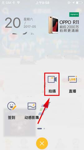 1)首先,我們先打開QQ空間軟件點(diǎn)擊下面的【+】進(jìn)入到功能欄,接著我們?cè)邳c(diǎn)擊進(jìn)入【拍攝】。(如下圖)