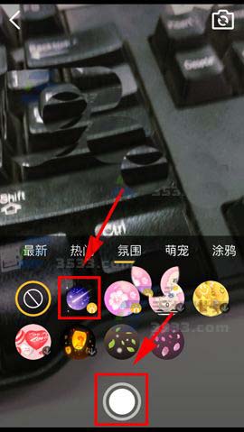 2)來到拍攝界面后先別急拍攝視頻,我們點(diǎn)擊右下角的【圖案】(這個(gè)是特效功能),接著我們?cè)谡业较矏鄣奶匦А?strong>點(diǎn)擊】使用,接著再按住下面的【圓點(diǎn)】開始拍攝視頻。(如下圖)