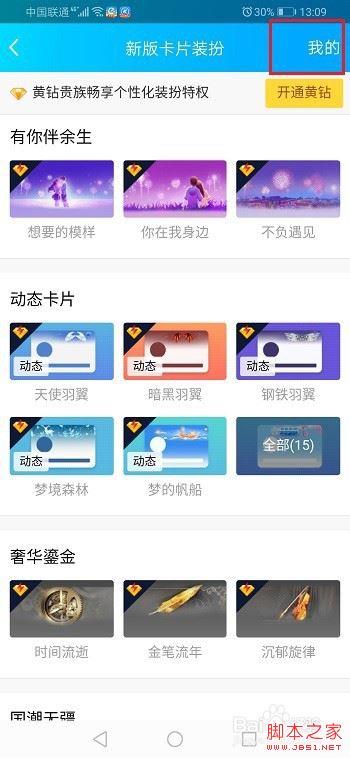 第三步進(jìn)去新版卡片裝扮界面之后,點(diǎn)擊我的,如下圖所示: