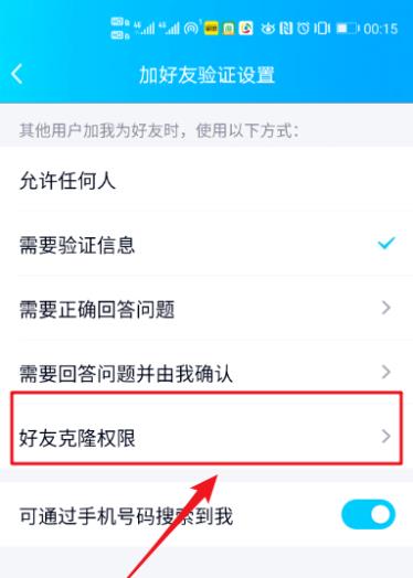 6、進入加好友驗證設置,點擊【好友克隆權限】