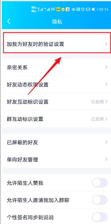5、進入隱私設置頁面,點擊【加我為好友時的驗證設置】