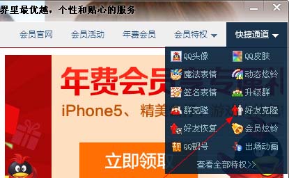 2、就會出現下圖這個頁面,把鼠標對應到右上角的 快捷通道 那里,顯示出QQ的很多功能單,然后點擊 克隆好友 。