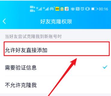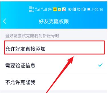 7、進入好友克隆權限設置頁面,點選【允許好友直接添加】即可